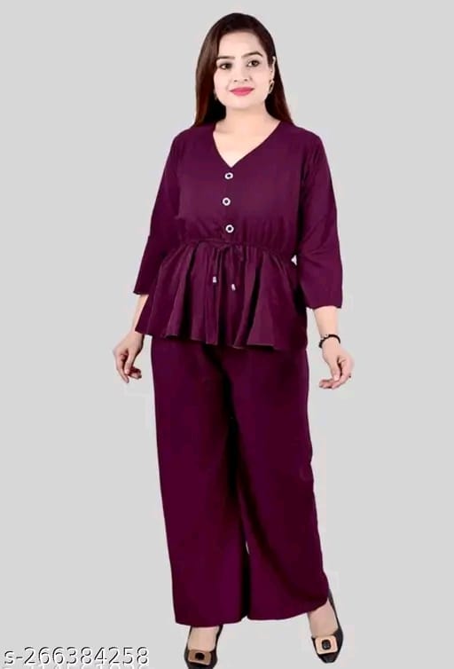 Beautiful Fashionable Trendy Women Top With Palazzo Set Quality of Fabric is too good very comfortable Top and Palazzo, Frock_Top,Kurti_Top, Jumpsuits, Beautiful solid colour jumpsuit for Women's special occasions Name: Women's Printed Maroon Rayon Top Fabric: Crepe Care Instructions: Machine Wash Care Instructions: Machine Wash Stylish and with Elegant look 2 Pieces Crop Top Fabric: Poly Crepe Sleeve Length: Three-Quarter Sleeves Pattern: Solid Net Quantity (N): 1 Sizes: XS (Bust Size: 34 in, Length Size: 48 in, Waist Size: 26 in) S (Bust Size: 36 in, Length Size: 48 in, Waist Size: 28 in) M (Bust Size: 38 in, Length Size: 50 in, Waist Size: 30 in) L (Bust Size: 40 in, Length Size: 50 in, Waist Size: 32 in) XL (Bust Size: 42 in, Length Size: 50 in, Waist Size: 34 in) solid color V-neck jumpsuit Beautiful stylish V-neck jumpsuit for women Women's party jumpsuit in solid color Casual V-neck jumpsuit for women Stylish solid color jumpsuit for women's fashion Women's beautiful V-neck jumpsuit for casual wear Solid color jumpsuit for women's evening events Country of Origin: India