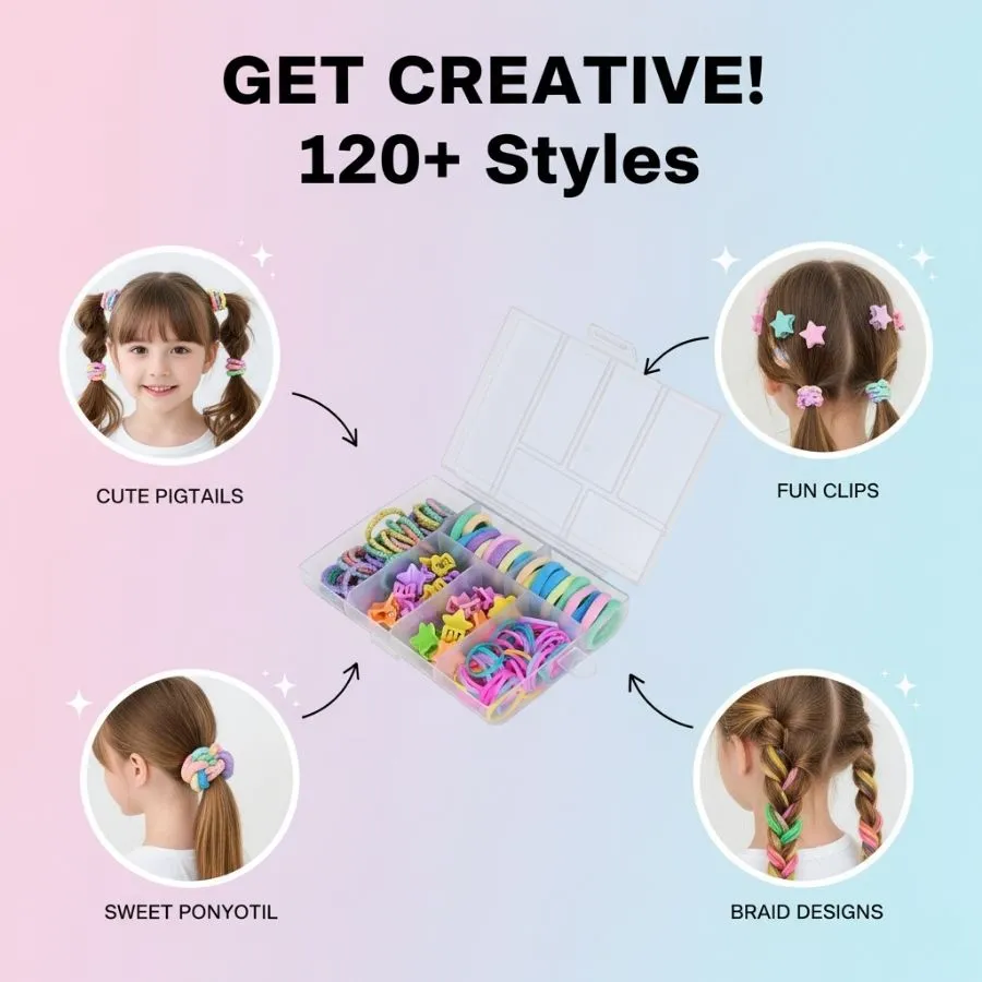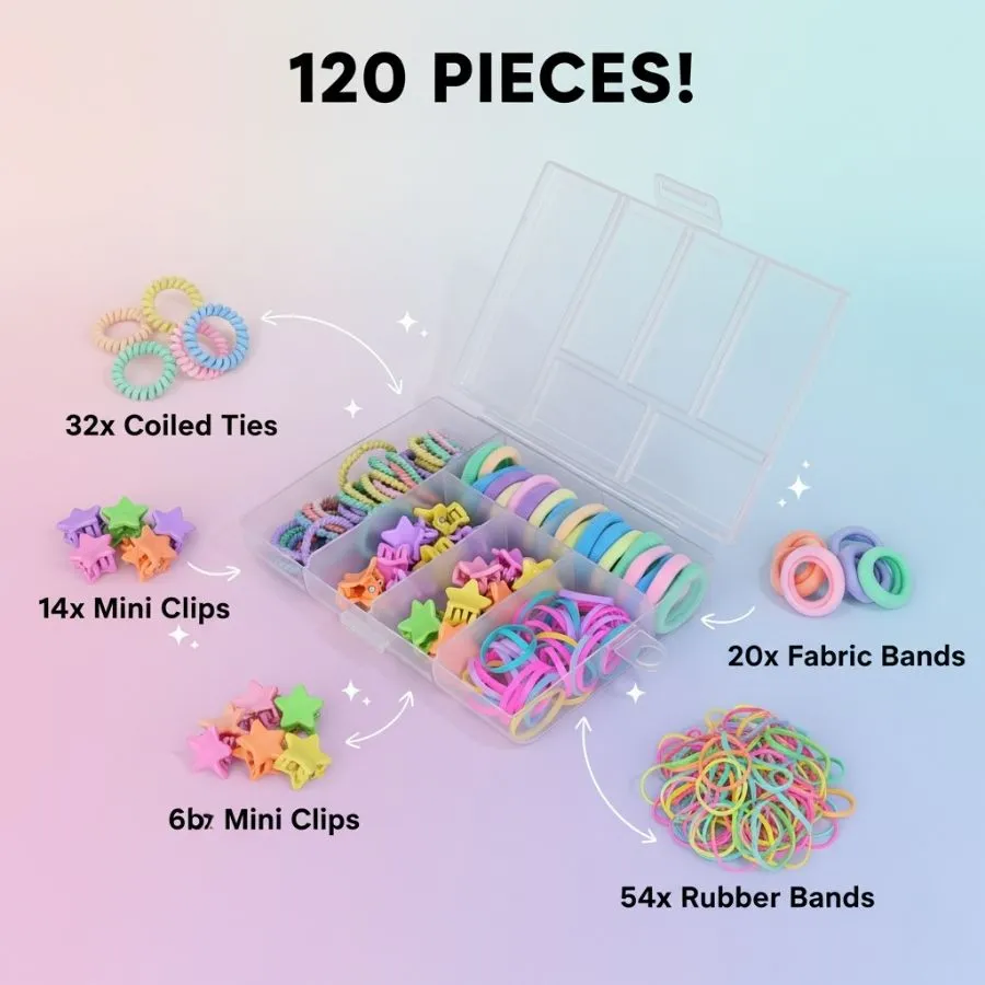 ZaiQuin 120-Piece Kids Hair Accessory Set – Pastel Candy Colored Mini Clips, Rubber Bands, & Fabric Ties – Ultimate Hair Styling Kit with Travel Organizer Box for Girls